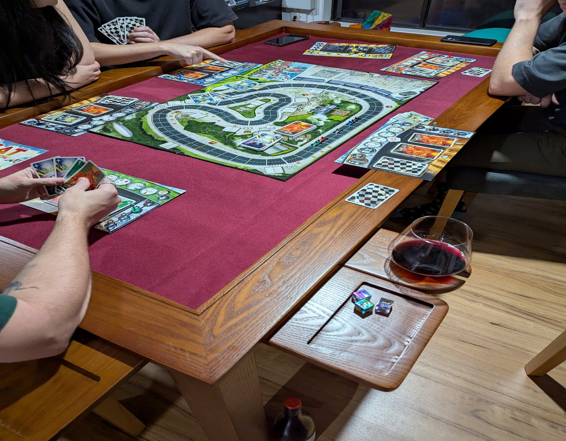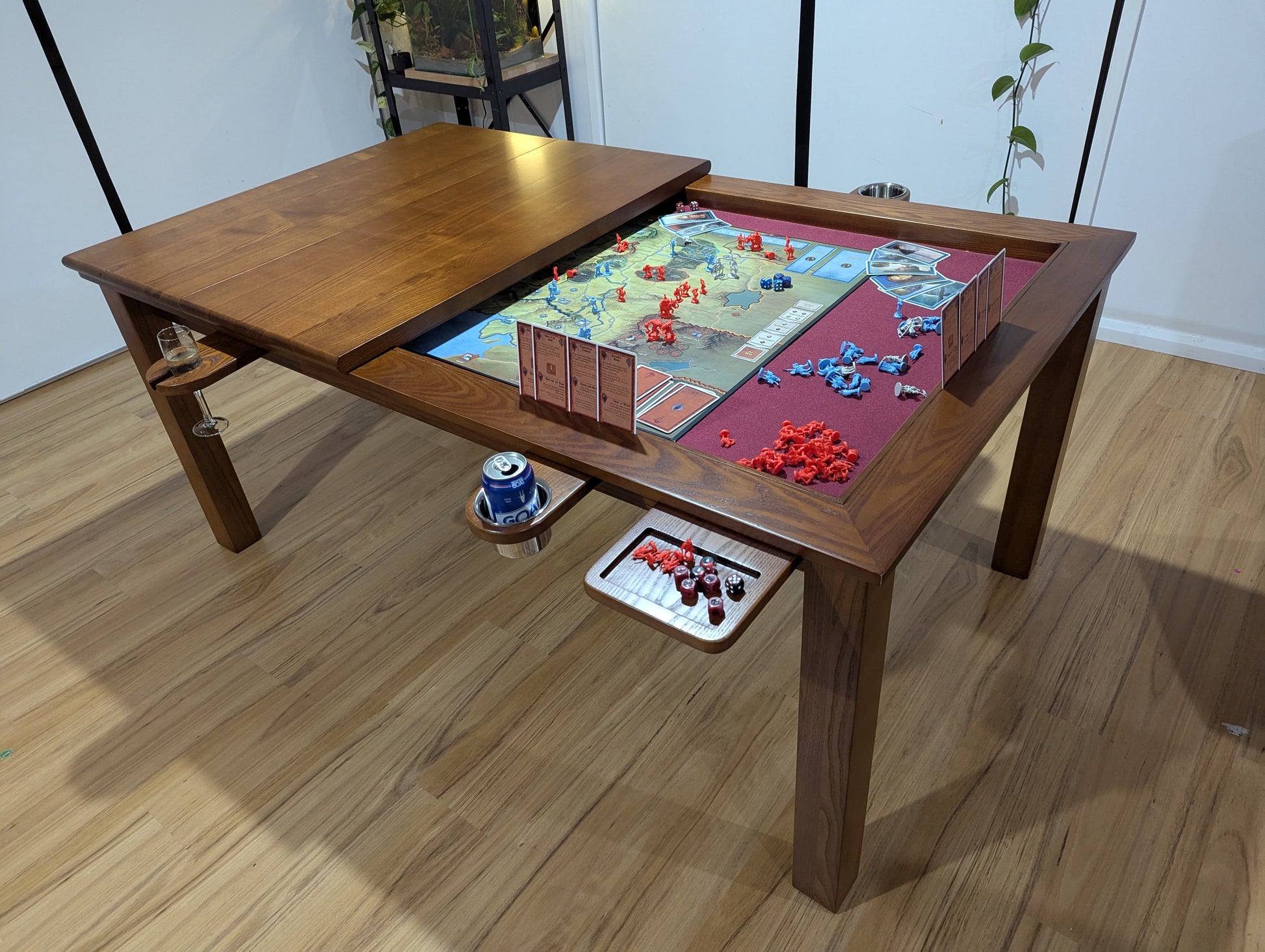 A gaming and designer dining table. Made from solid hardwood and designed for play in mind, table includes: